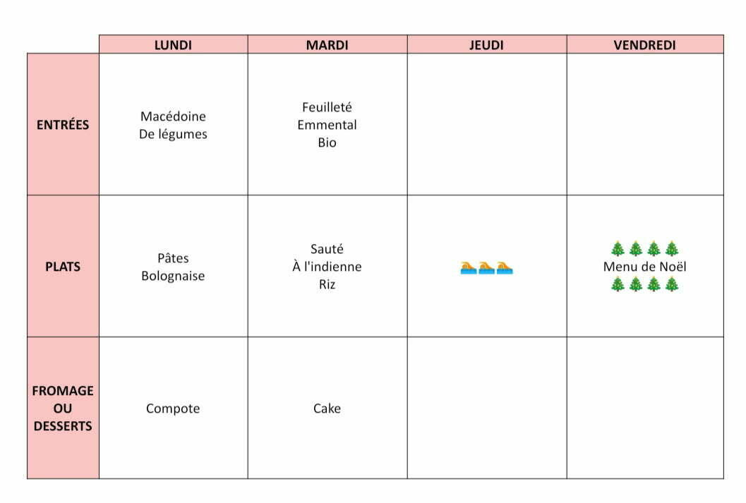 Voici le menu de cette semaine :