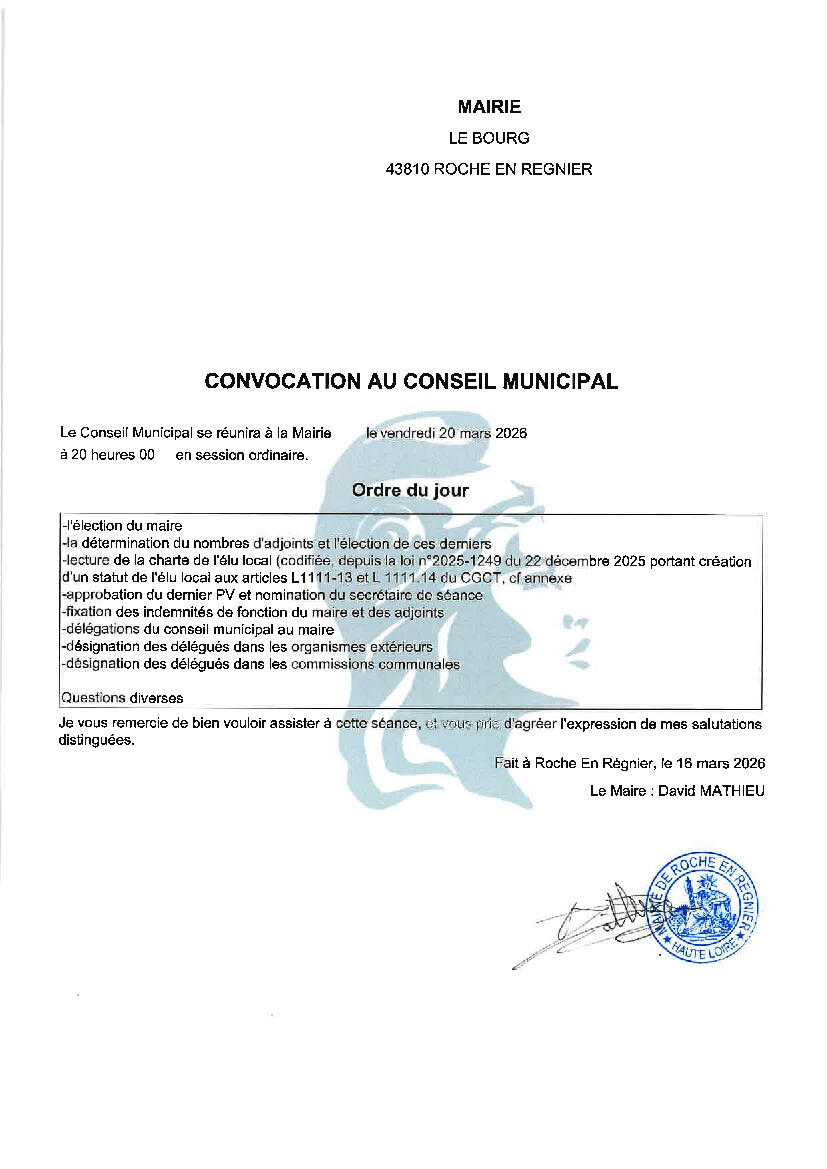 Prochain conseil municipal : vendredi 20 mars 2026 16/03/2026 Voici l'ordre du jour du prochain conseil municipal :