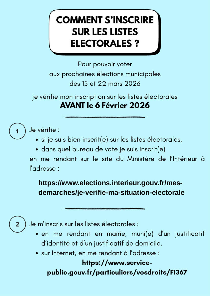 Inscriptions sur les listes électorales 12/01/2026 Vous avez jusqu'au 6 février pour vous inscrire sur les listes électorales.