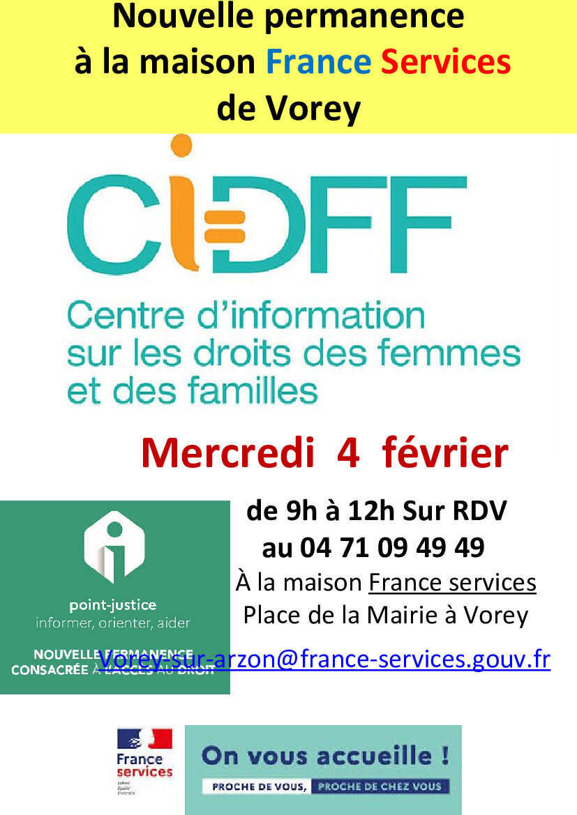 Permanences du CDIFF : Centre d'Information sur les Droits des Femmes et des Familles. Maison France Services de Vorey