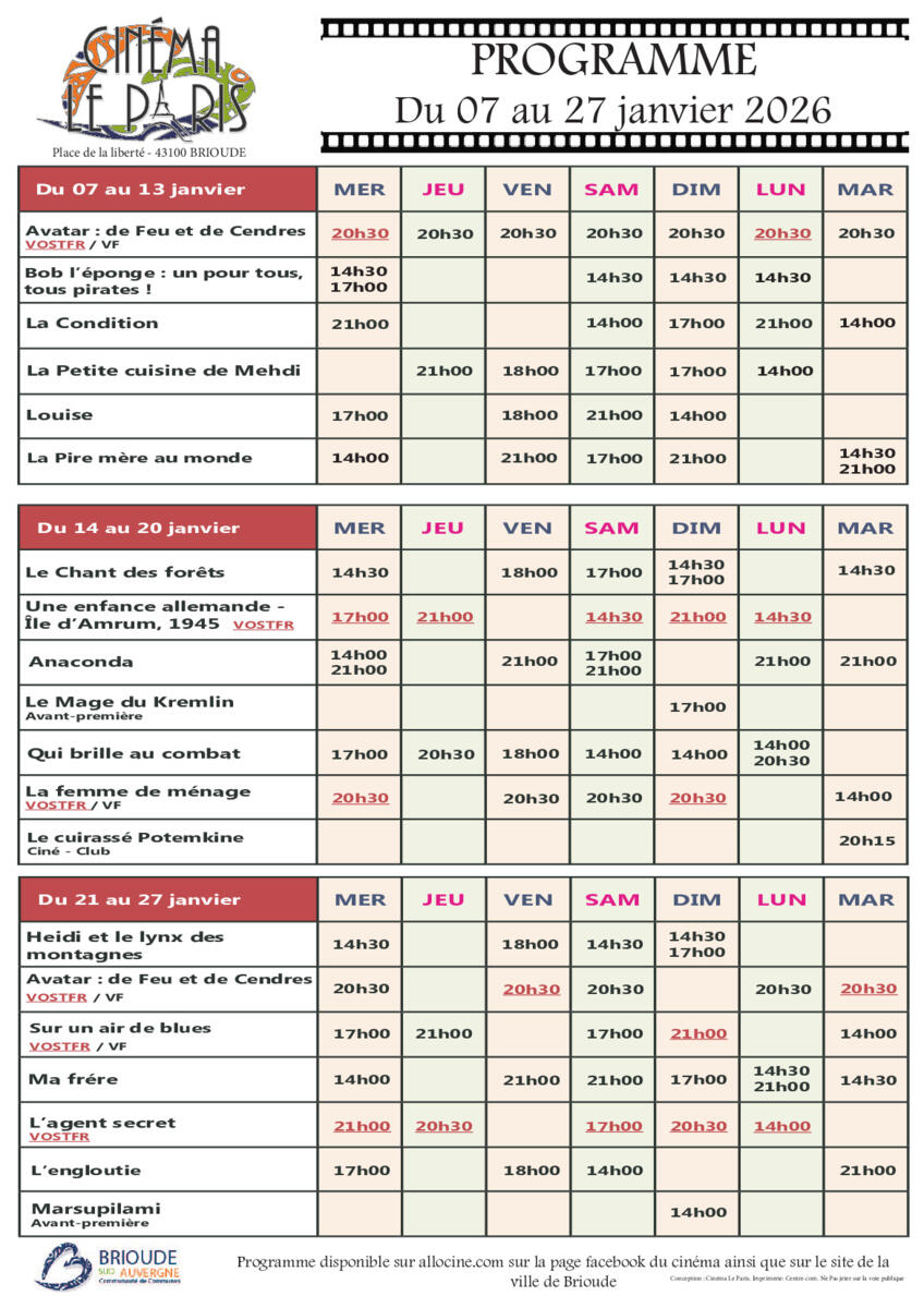programme du Cinéma Le Paris pour la période du 7 au 27 janv