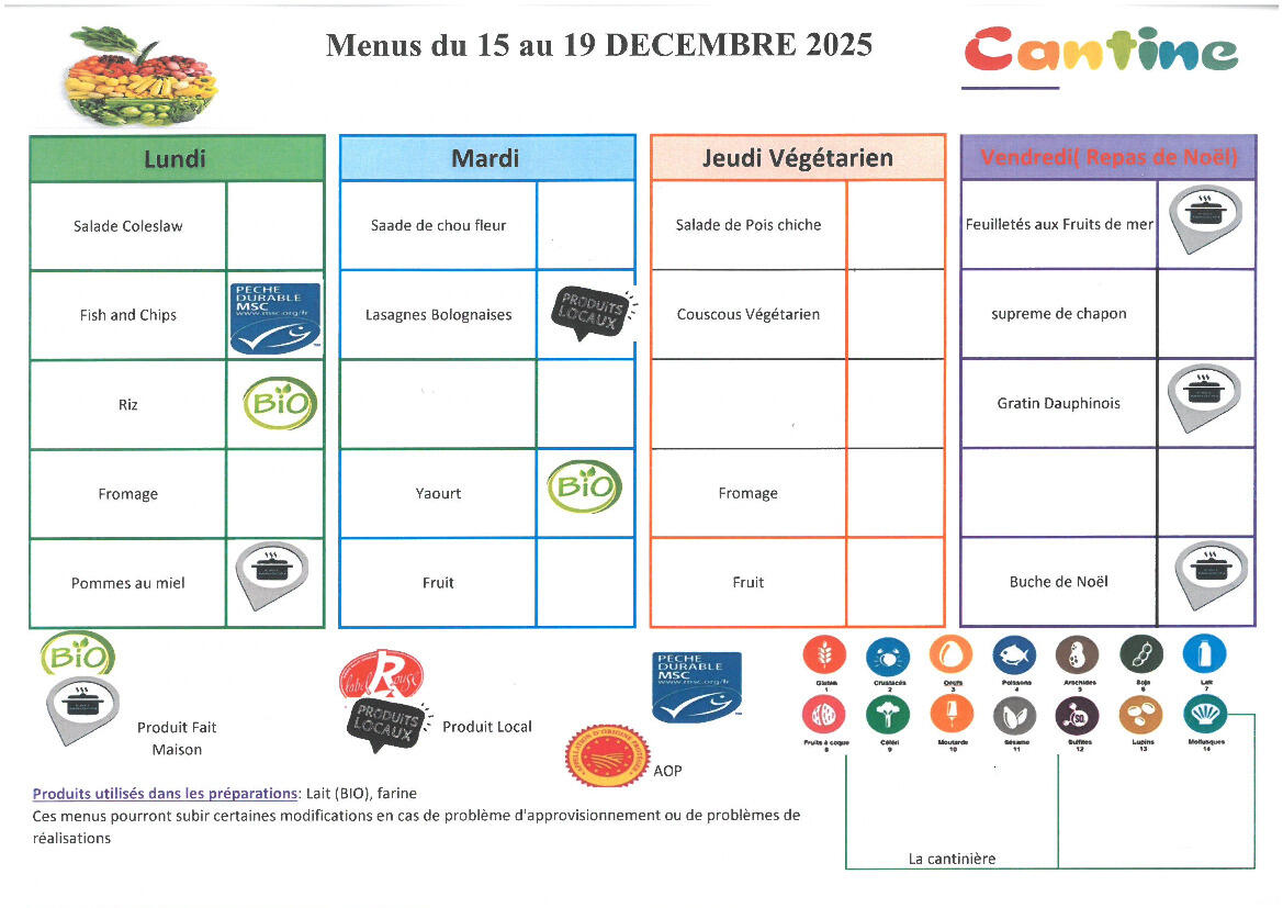 Menu cantine scolaire du 15 au 19 décembre 2025 15/12/2025 Menus cantine scolaire du 15 au 19 décembre 2025