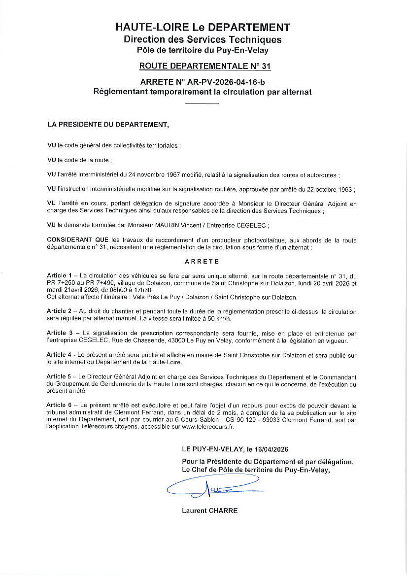La circulation des véhicules se fera par sens unique alterné sur la RD 31 au village de Dolaizon lundi 20 et mardi 21 avril 2026 de 8h00 à 17h30.