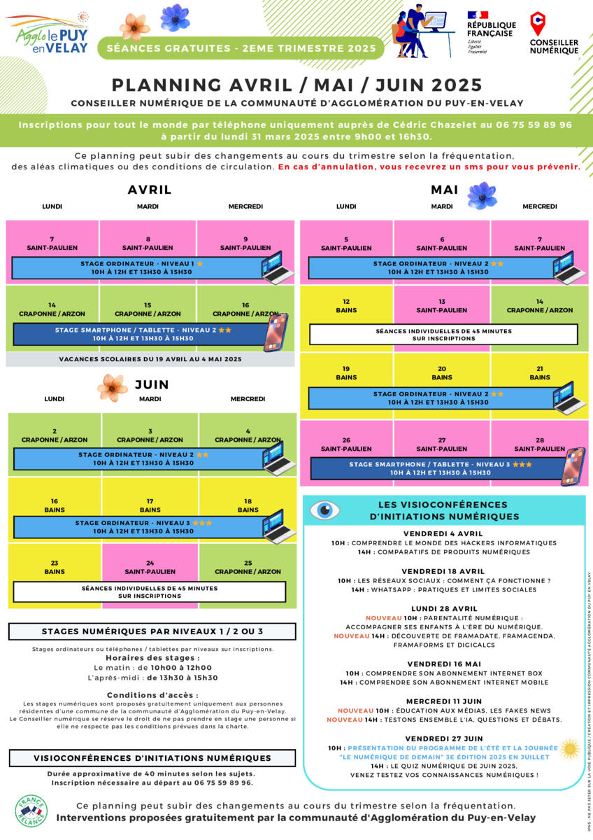 Dans le cadre des actions de médiation numérique sur le territoire de la communauté d'Agglomération du Puy-en-Velay, vous trouverez ci joint le planning définitif du 2e trimestre 2025 (Avril / Mai / Juin 2025) - Inscriptions possibles à partir du lundi 31 mars 2025.