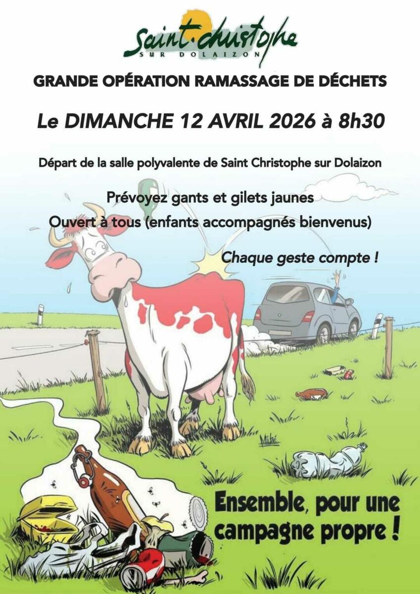 Grande opération ramassage de déchets 08/04/2026 Dimanche 12 avril à 8h30 devant la salle polyvalente Source : Mairie de Saint-Christophe-sur-Dolaizon