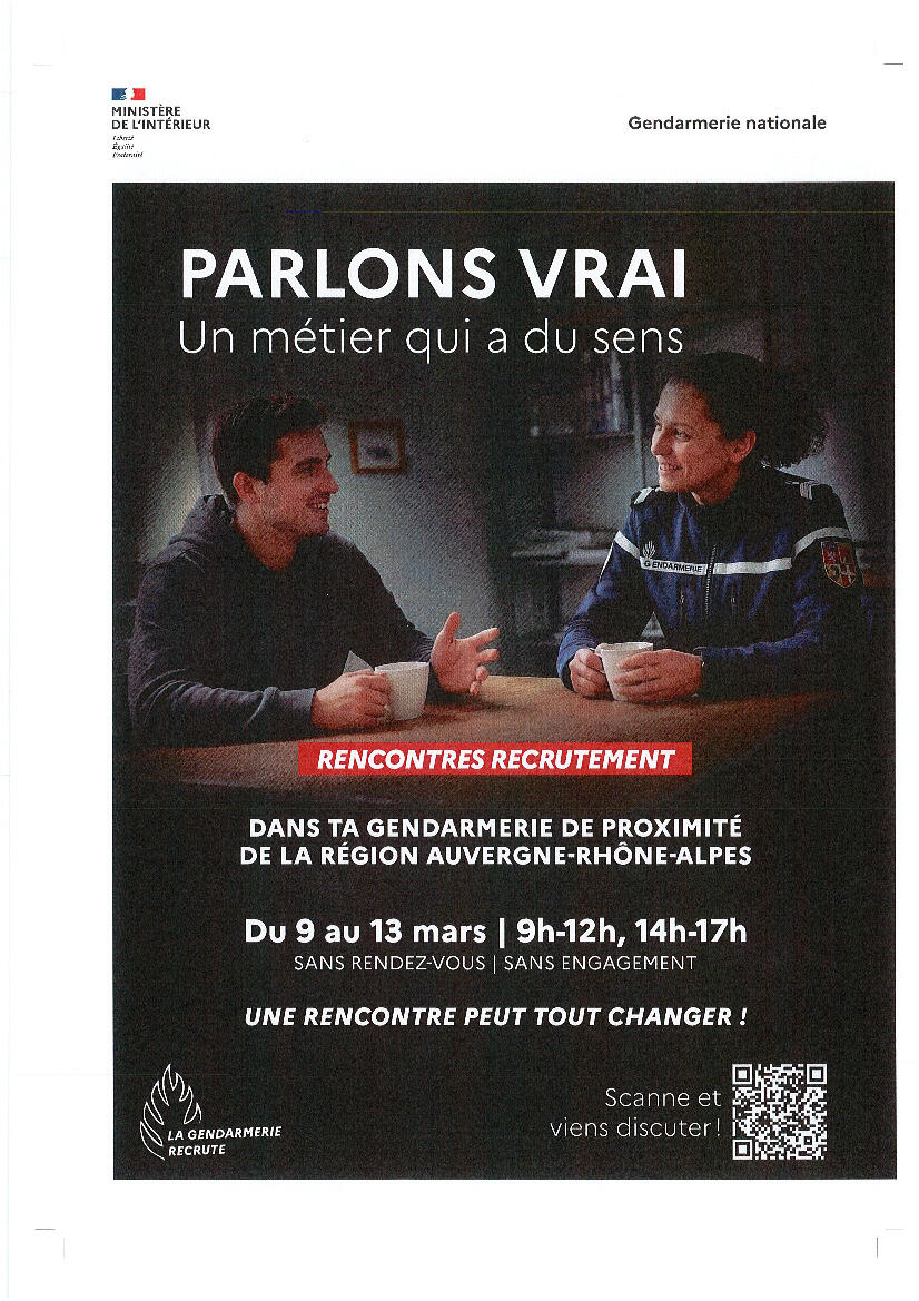 Le groupement de gendarmerie départementale de la HAUTE-LOIRE a le plaisir d'organiser, en parallèle de sa journée portes ouvertes (le samedi 25 avril 2026), une semaine de recrutement, qui se tiendra du 9 au 13 mars 2026, au sein de toutes les communautés de brigades de notre département.