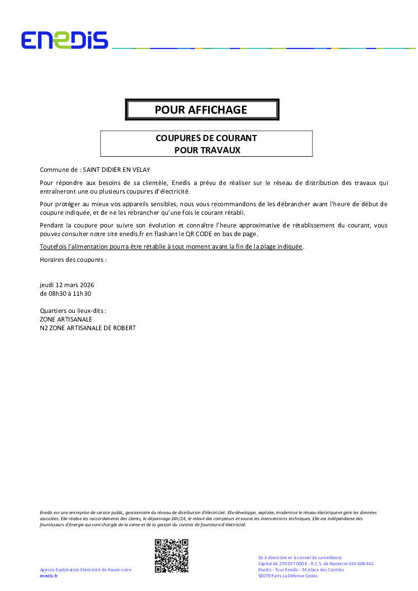 Afin de répondre aux besoins de sa clientèle, Enedis réalisera des travaux sur le réseau de distribution, entraînant une ou plusieurs coupures d’électricité.