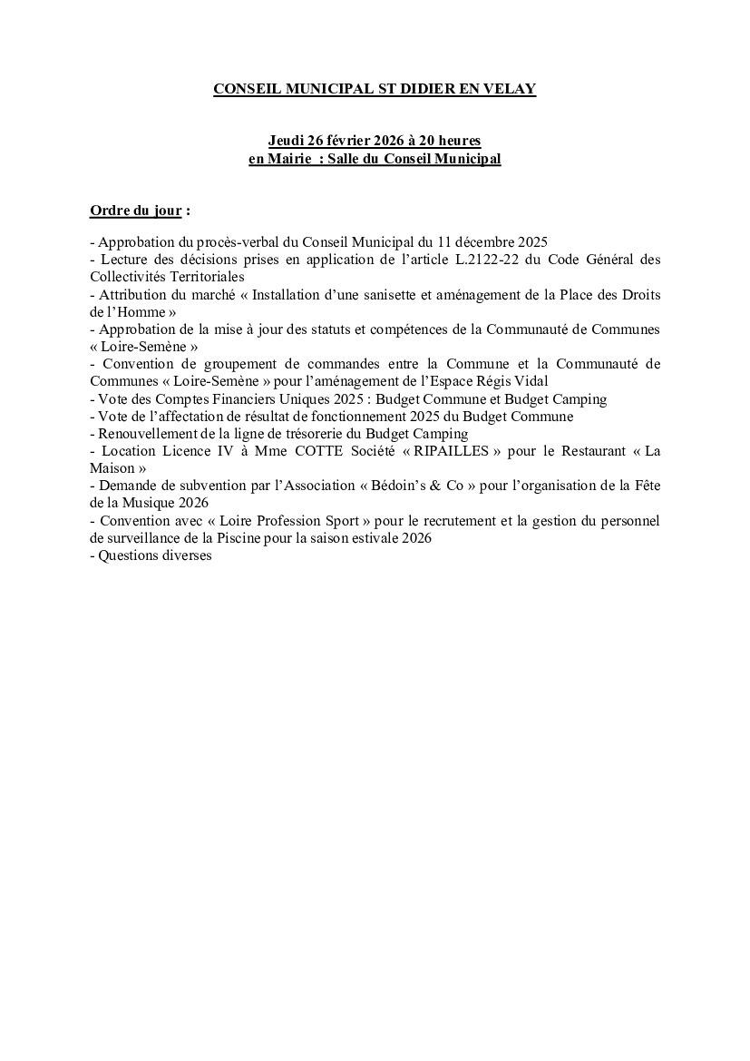 Ordre du jour du prochain conseil municipal, le 26 février
