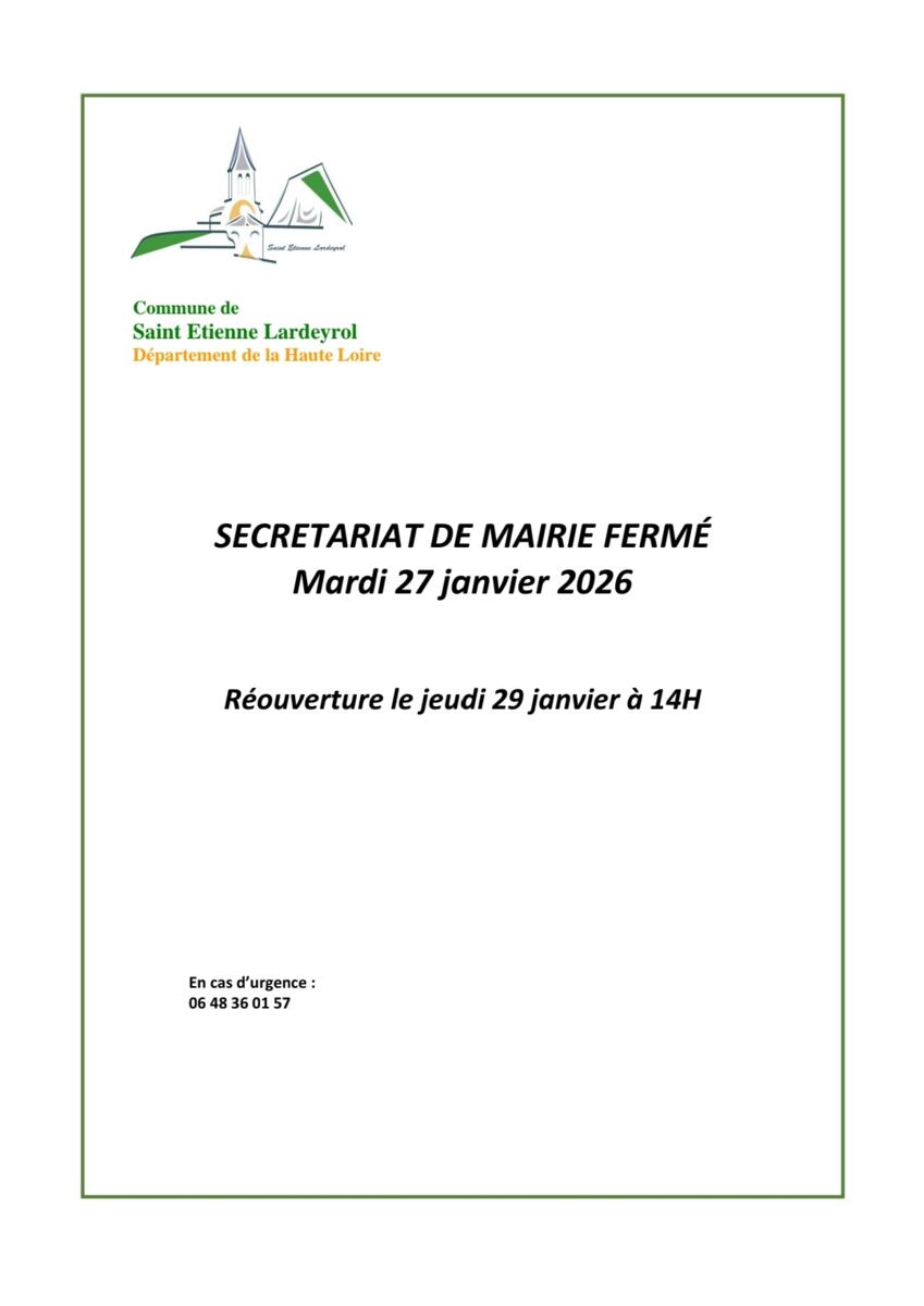 Fermeture Du Secrétariat De Mairie Mardi 27/01 23/01/2026 Le secrétariat de mairie sera fermé ce mardi 27 janvier 2026. Réouverture au public le jeudi 29 janvier à 14h00. Merci de votre compréhension.