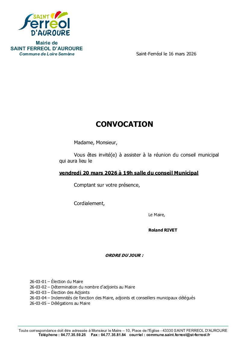 Vous êtes invité(e) à assister à la réunion du conseil municipal qui aura lieu le vendredi 20 mars 2026 19h salle du conseil Municipal