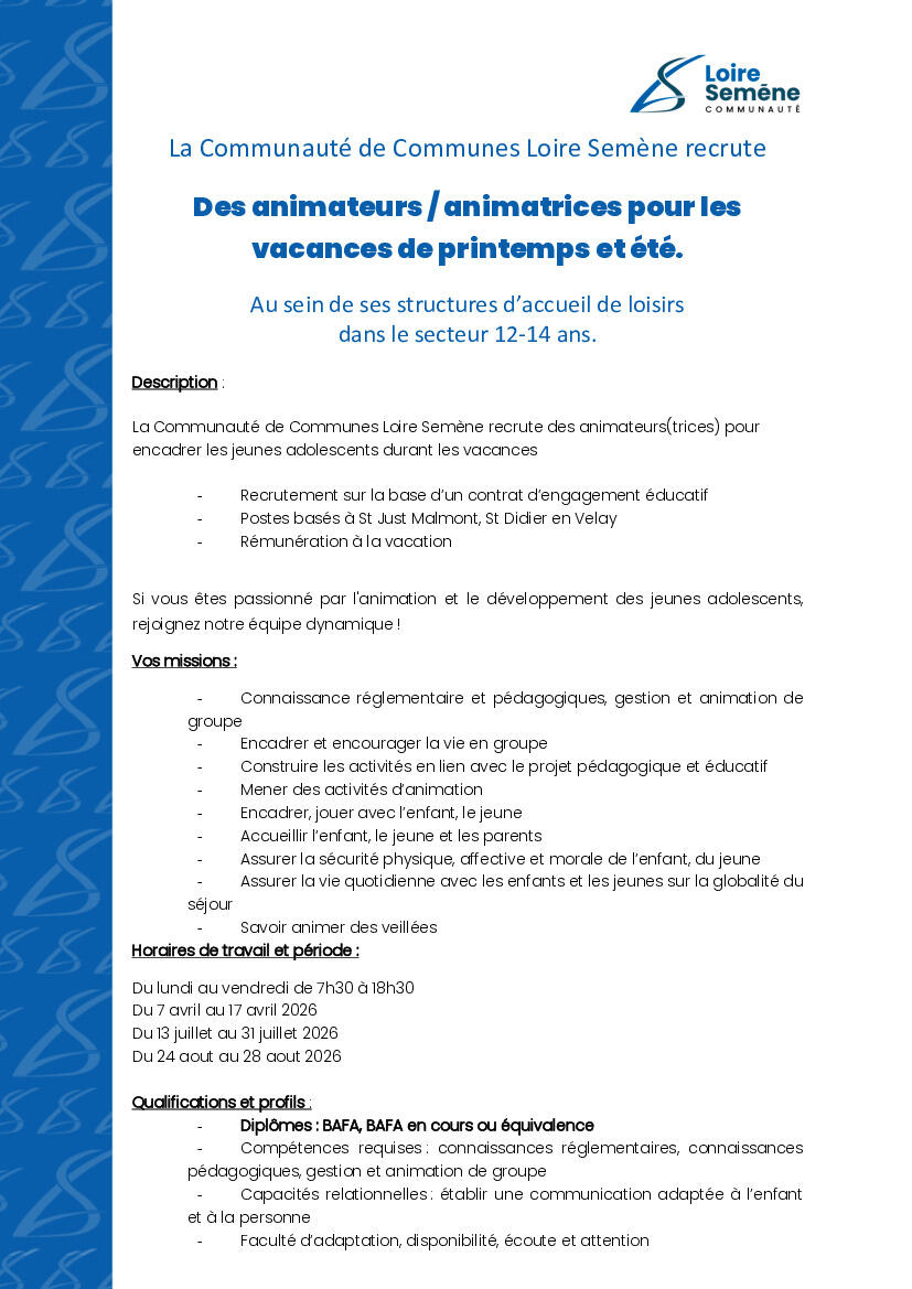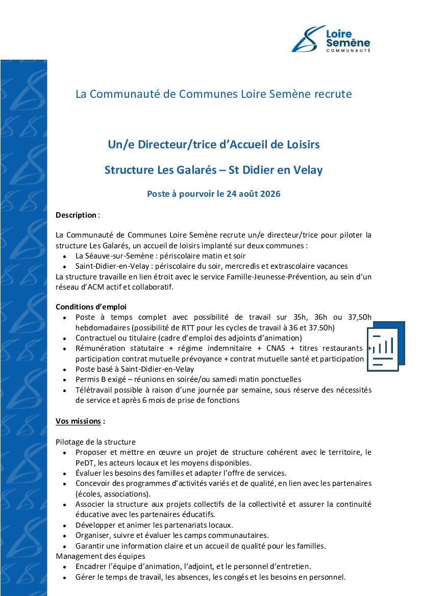 La Communauté De Communes Loire Semène Recrute 25/03/2026 La Communauté de Communes Loire Semène recrute Des animateurs / animatrices pour les vacances de printemps et été. Un/e Directeur/trice d’Accueil de Loisirs Structure Les Galarés – St Didier en Velay