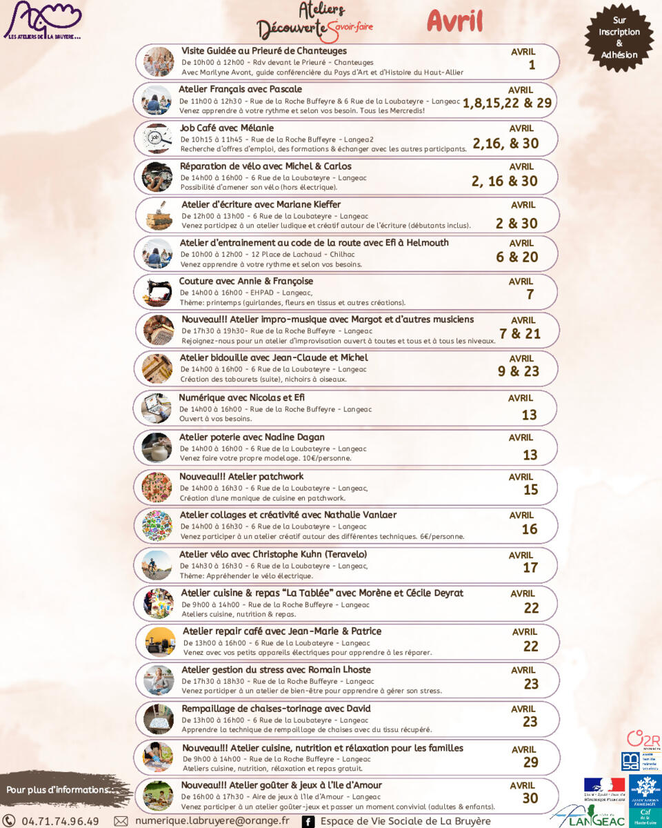 Programme des ateliers découverte savoir-faire mois d'avril