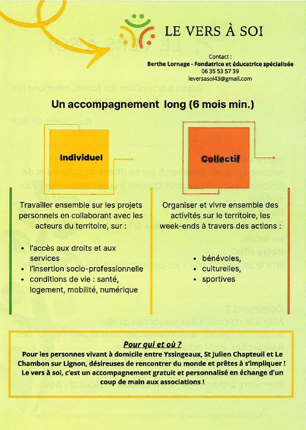 Contact : Berthe Lornage - Fondatrice et éducatrice spécialisée : 06 35 53 57 39 - leversasoi43@gmail.com