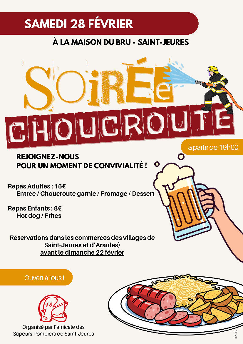 L’Amicale des Sapeurs-Pompiers de Saint-Jeures vous invite à une soirée choucroute conviviale le samedi 28 février, à partir de 19h, à la Maison du Bru à Saint-Jeures.