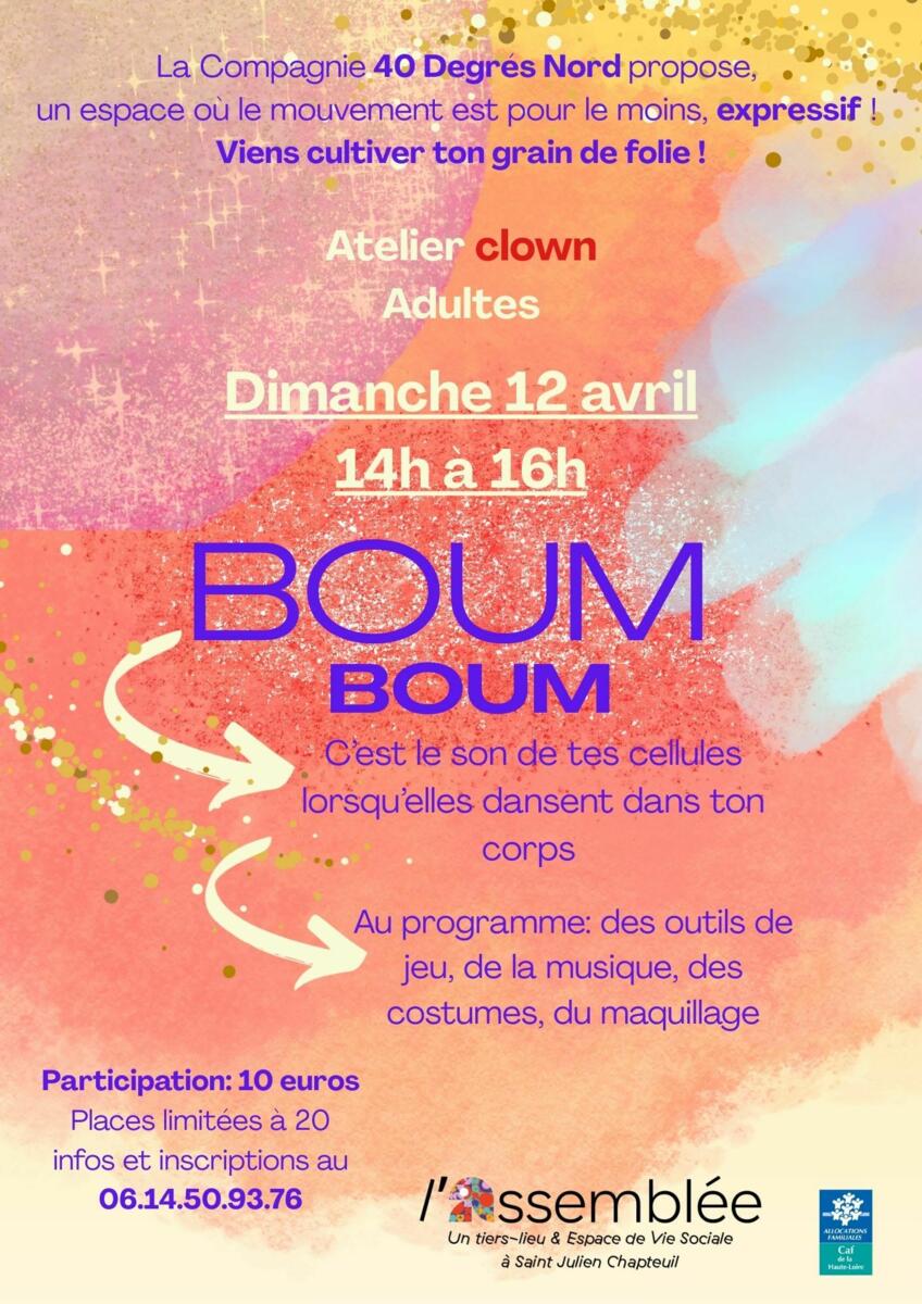 Atelier Clown Adulte Boum Boum 27/03/2026 Le dimanche 12 avril de 14h à 16h. Organisé par l'association L'assemblée en partenariat avec la compagnie 40 Degrés Nord