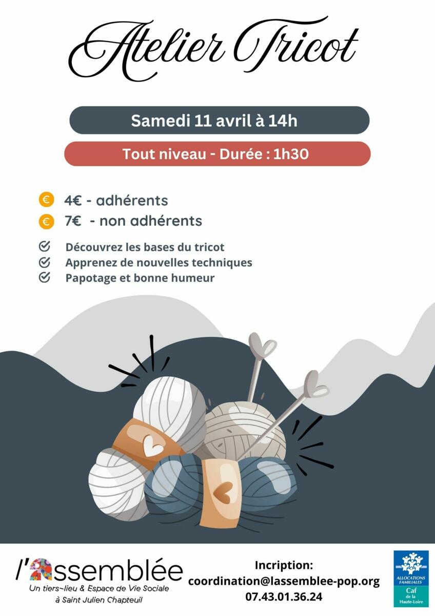 Atelier Tricot 26/03/2026 Le samedi 11 avril de 14h à 15h30 au pôle culturel L'Echappée. Ouvert à tous, quelque soit votre niveau, débutant.e ou confirmé.e. Organisé par l'association L'assemblée en partenariat avec Mel s'en Maille.