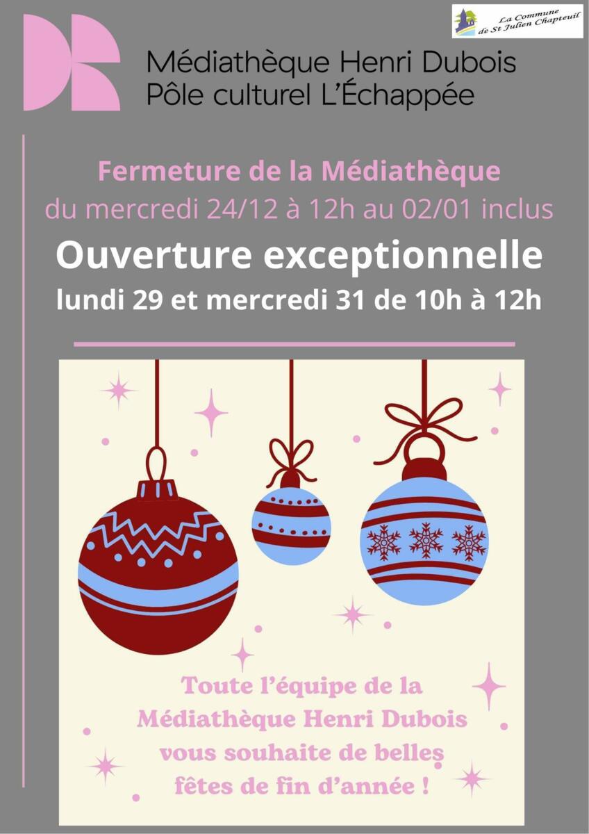 Horaires De La Mediatheque Pour Les Vacances De Noël 17/12/2025 Fermeture de la Médiathèque du mercredi 24/12 à 12h00 au vendredi 02/01 inclus Sauf ouverture exceptionnelle de 10h à 12h le lundi 29 et mercredi 31/12