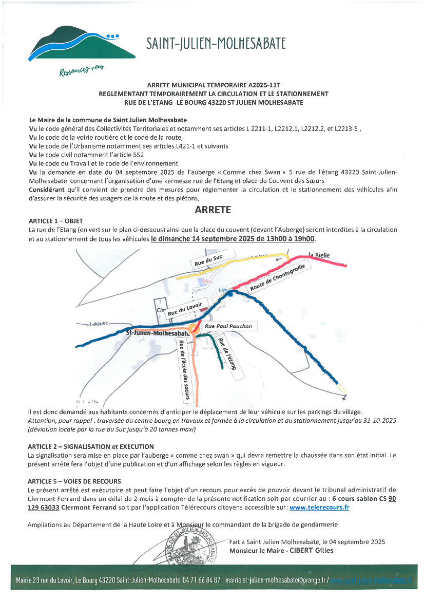 la rue de l'étang et la place du couvent seront fermées à la circulation et au stationnement de 13h à 19h ; les habitants concernés devront anticiper le déplacement de leur véhicule