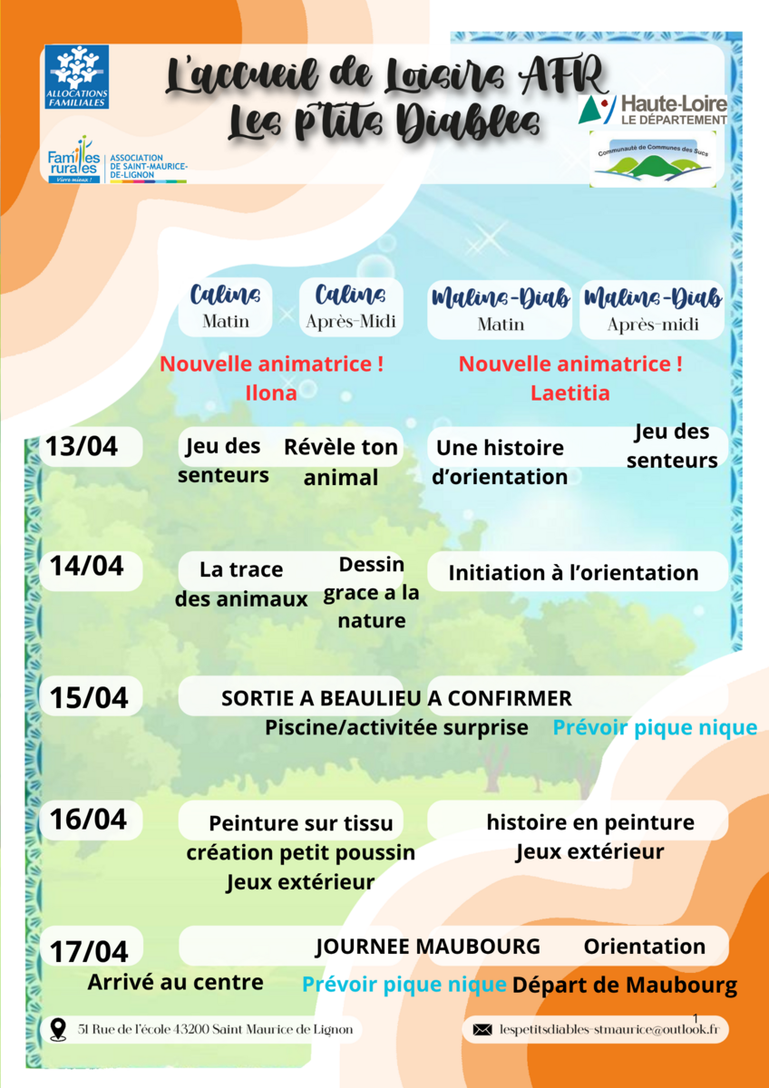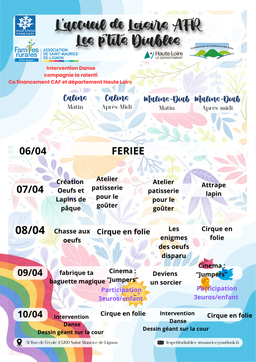 Centre de Loisirs - Programme vacances 07/04/2026 Retrouvez ci-dessous le programme des vacances au centre de Loisirs