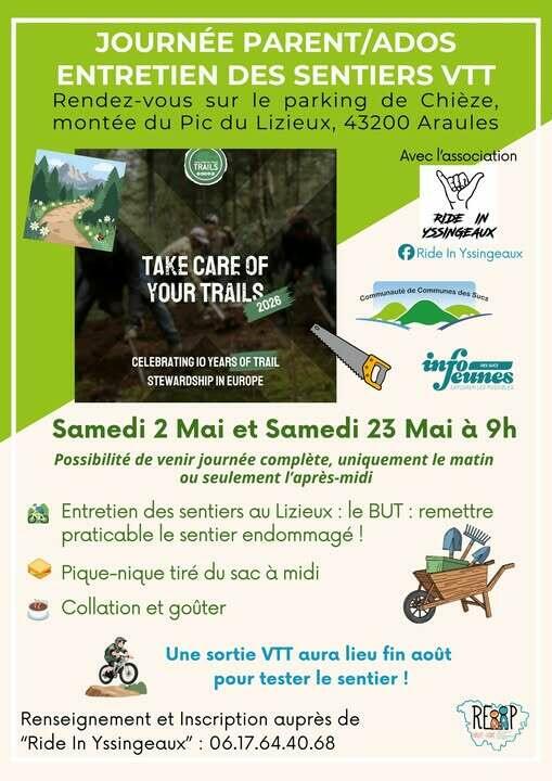 En partenariat avec Ride In Yssingeaux, la Communauté de Communes des Sucs vous propose de participer à l'entretien des sentiers VTT du Lizieux. Un moment en pleine nature à partager avec votre ado !