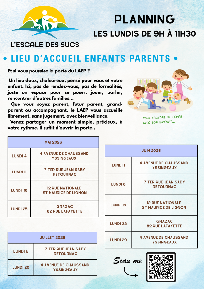 Voici le planning pour les temps d'accueil parents-enfants pour la période du mois de mai à juillet 2026