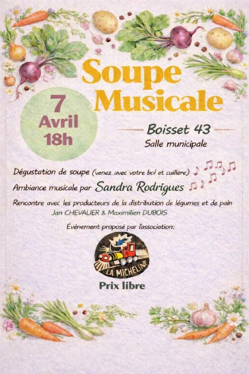 L'Association La Micheline vous donne rendez-vous le mardi 7 avril à partir de 18h à la salle municipale de Boisset pour une nouvelle soupe musicale en compagnie de Sandra Rodrigues … N’oubliez pas votre bol et votre cuillère !!