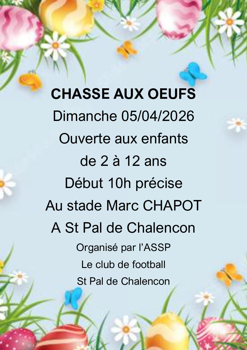 Chasse Aux Oeufs 03/04/2026 Dimanche 5 Avril 2026, rendez-vous à 10h précise, au stade Marc CHAPOT, à St Pal de Chalencon. Ouverte aux enfants de 2 à 12 ans. Organisée par l'ASSP (club de foot).