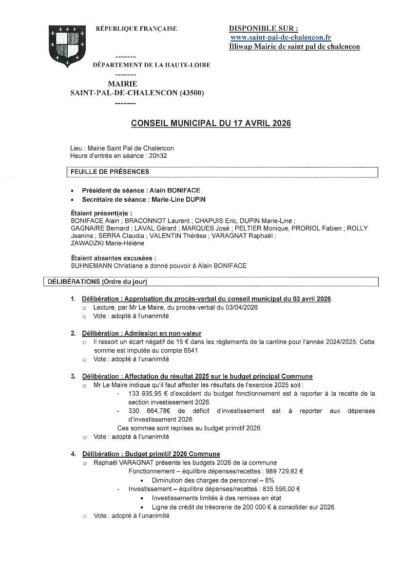 Compte-Rendu Du Conseil Municipal Du 17 Avril 2026