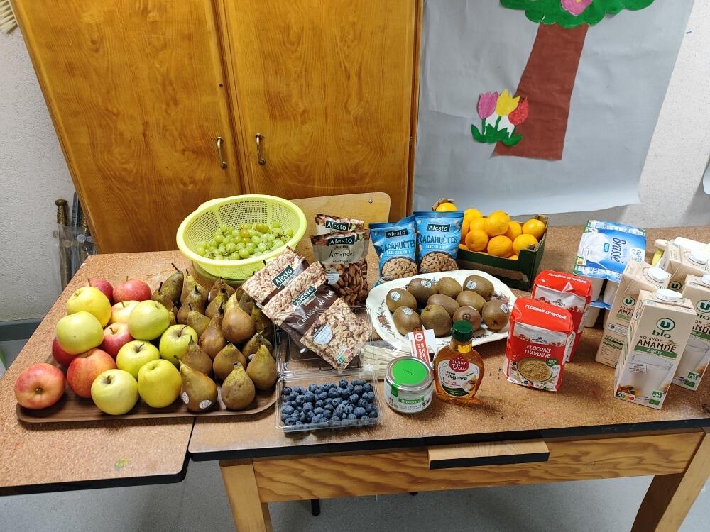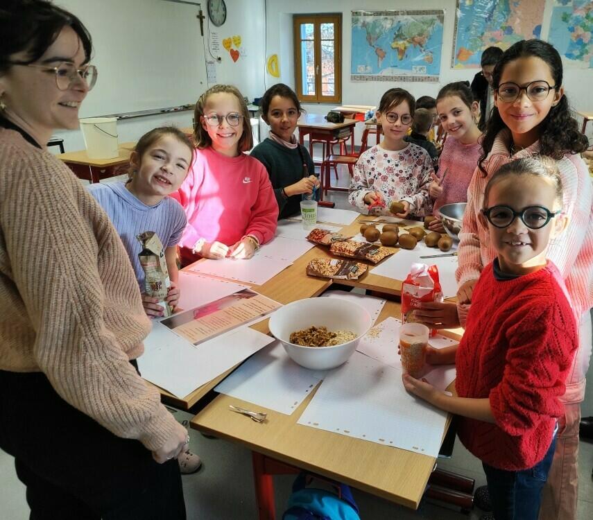 Après avoir appris à élaborer des menus équilibrés, les écoliers se sont mis aux fourneaux lors d’un atelier cuisine dans l’école où ils ont concocté puis dégusté des recettes originales de petits déjeuners sains, équilibrés, pour être en forme toute la matinée sans coup de pompe ! Au menu : brochettes de fruits frais de saison, smoothies poires/pommes au lait végétal, coupes de yaourt au muesli maison… et jus de pommes du pommier de la cour de récré ! Un régal apprécié des petits comme des grands !