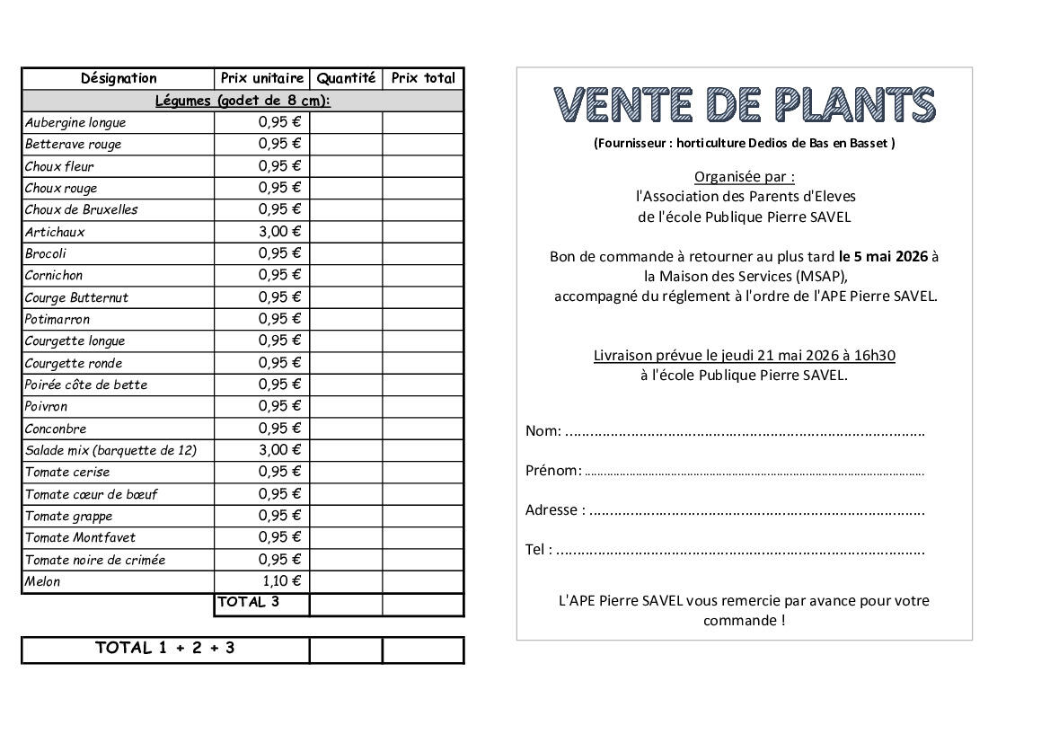L'Association des Parents d'Elèves de l'école publique Pierre SAVEL vous propose sa traditionnelle vente de plans de fleurs et légumes.