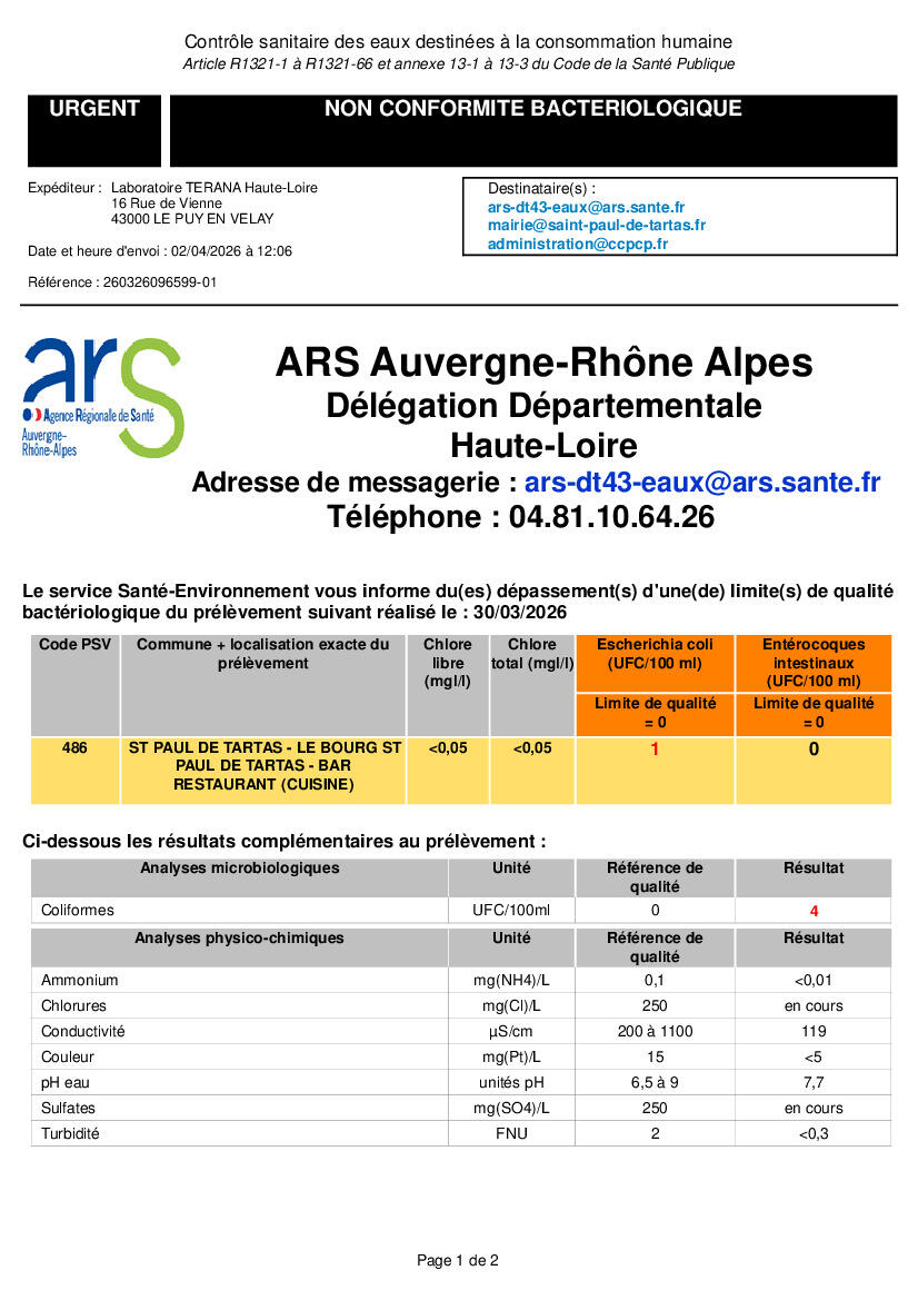 Cependant dans un cas comme dans l'autre l'Agence Régionale de Santé (ARS), délégation de Haute-Loire, souligne le très faible niveau de contamination ; il ne peut être exclu que la contamination soit d'origine domestique ou a avoir pour origine la réalisation du prélèvement.