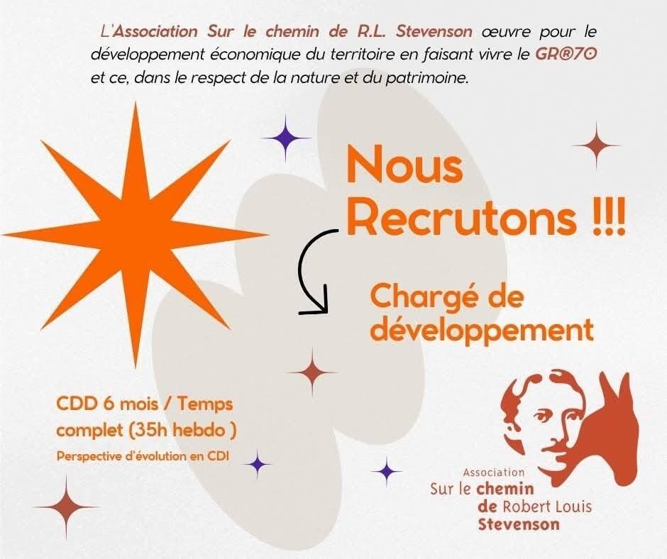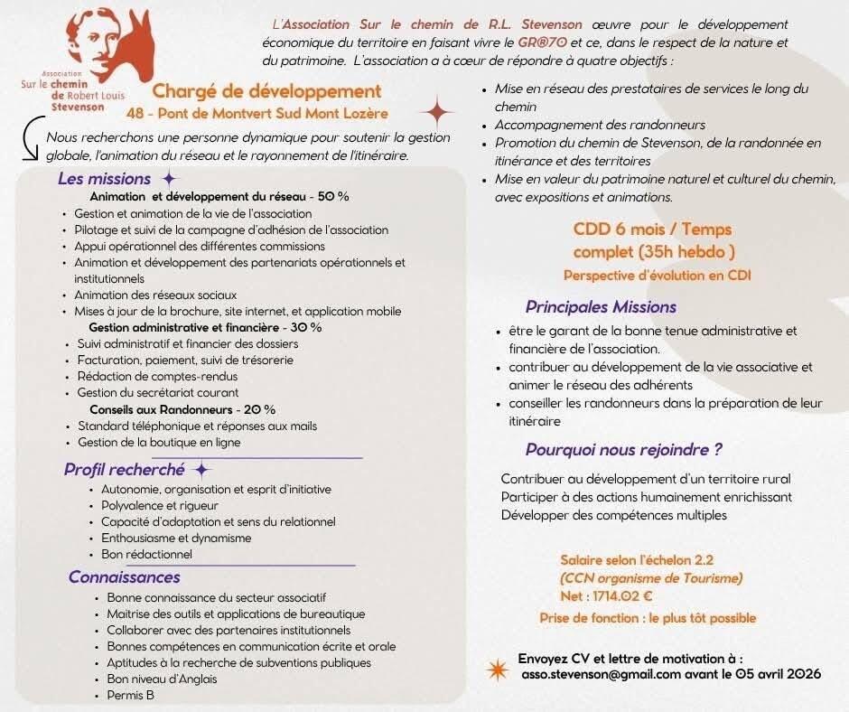 Aussi nul ne peut rester insensible à l'offre de l'emploi de charge de developpement proposée par l'association Sur le chemin de Robert-Louis Stevenson.