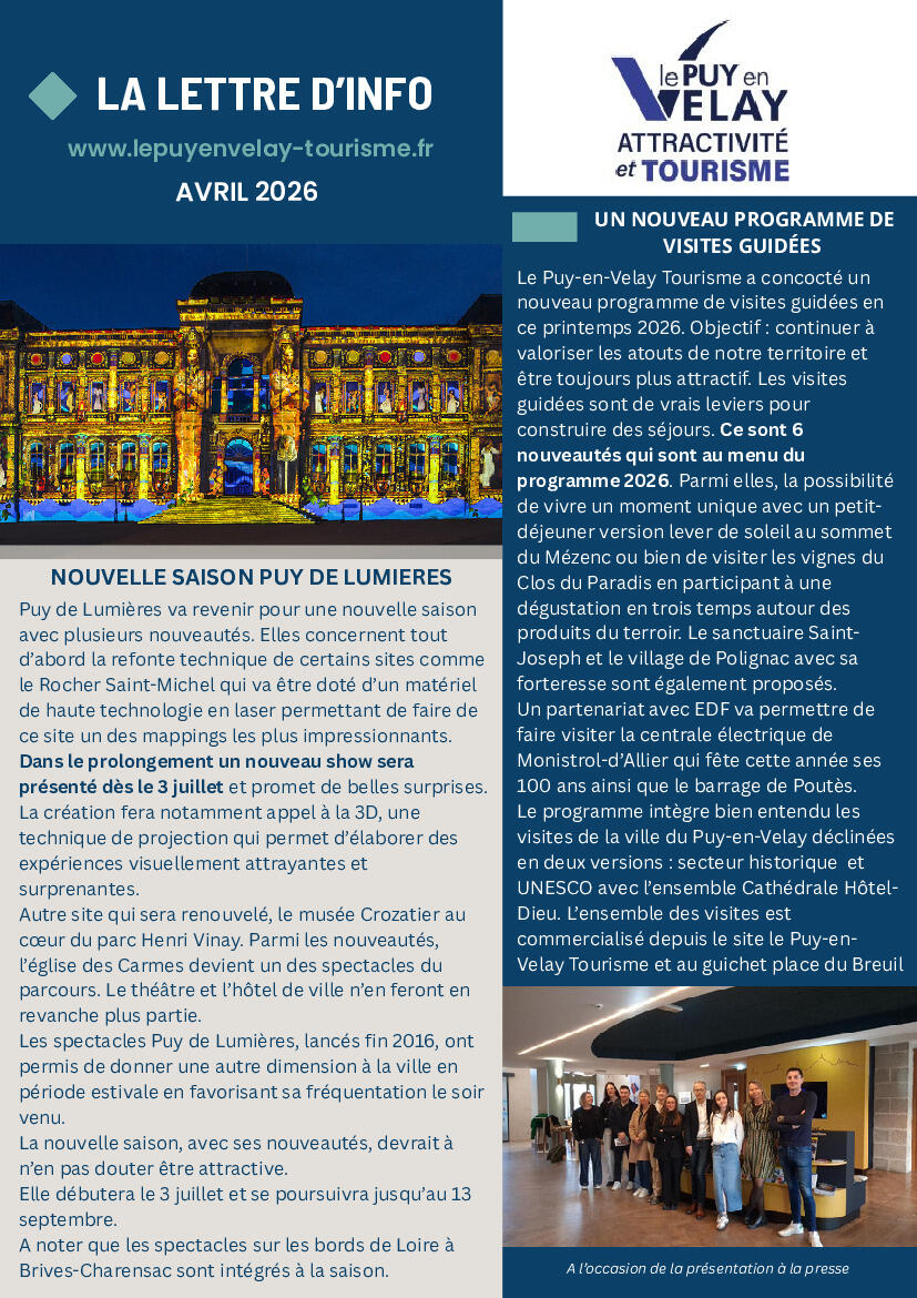 Lettre D'information "Le Puy En Velay Tourisme" Avril 2026 03/04/2026 Vous trouverez ci-jointe la lettre d'information "Le Puy-en-Velay Tourisme" de Avril 2026 (3 pages).