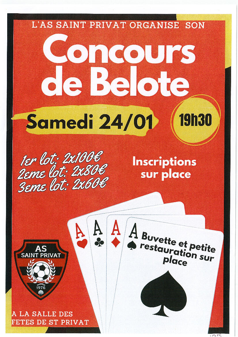 CONCOURS DE BELOTE 12/01/2026 L'association sportive de Saint Privat d'Allier organise un concours de belote
