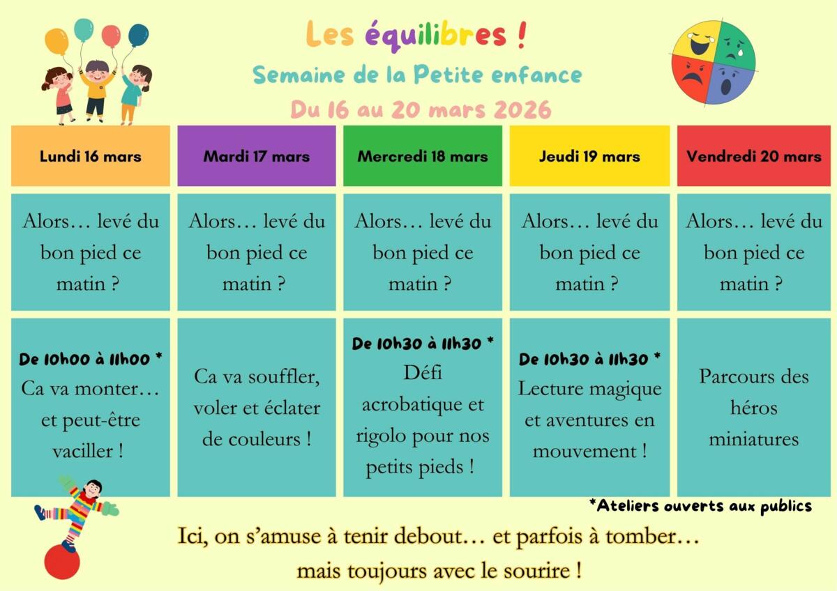 Dans le cadre de la Semaine de la Petite Enfance, nous avons le plaisir de vous inviter à découvrir nos trois ateliers ouverts au public, destinés à tous. Ces ateliers sont libres d’accès et permettront aux participants de partager des moments ludiques, éducatifs et conviviaux.