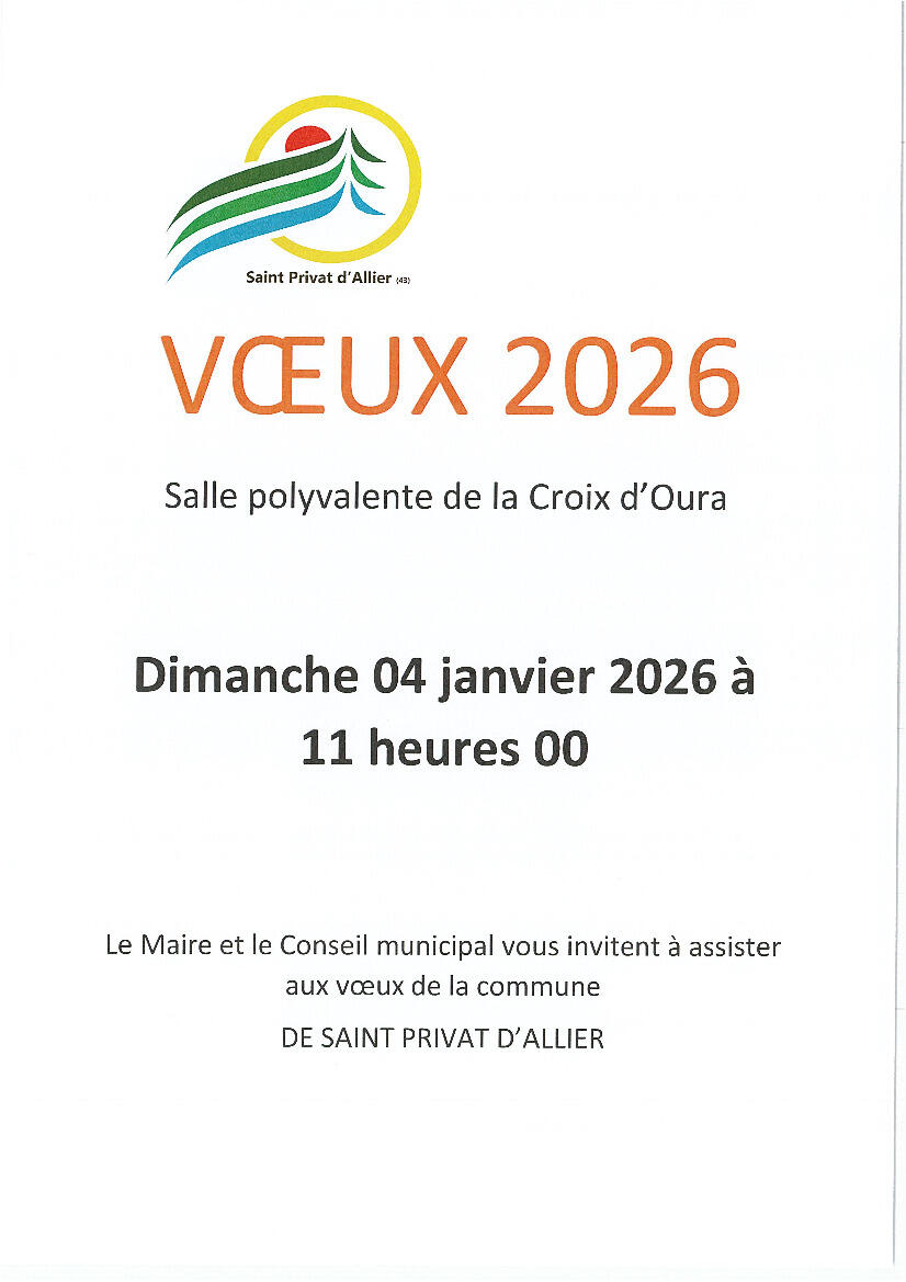 VOEUX 2026 03/01/2026 Rappel : Cérémonie des voeux le 04 janvier 2026 Source : Mairie de Saint-Privat-d'Allier