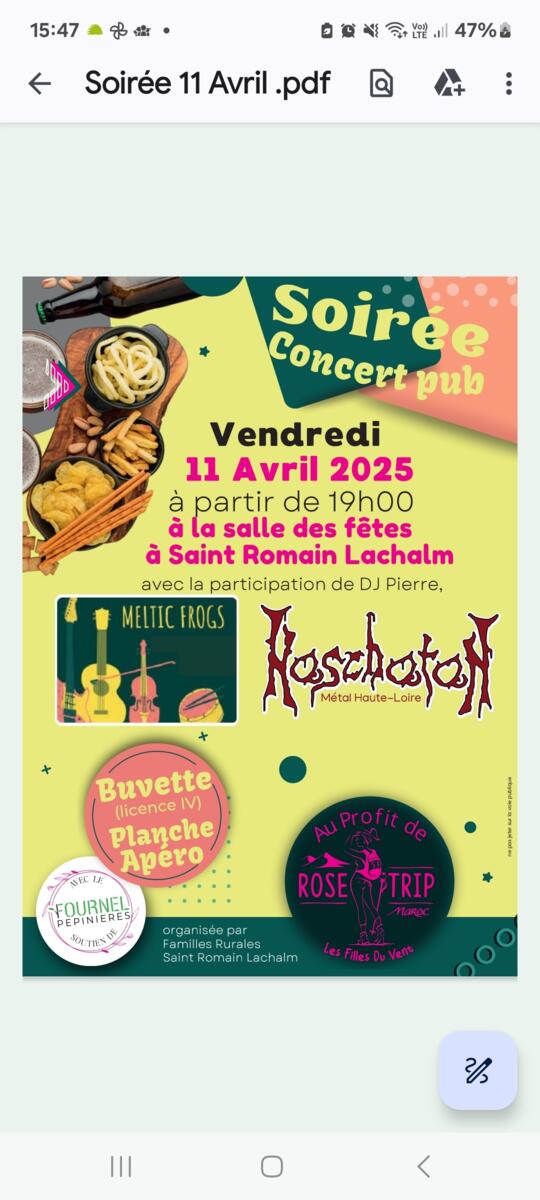 Dans le cadre de la validation de sa licence IV, la commune de St Romain Lachalm, avec le soutien des associations du village, vous présente sa 1ere animation le vendredi 11 avril à 19h00 avec 2 concerts à la salle des fêtes. Les bénéfices de la soirée organisé par Familles Rurales et Les filles du vent seront reversés à l association les filles du vent. A vos agendas.