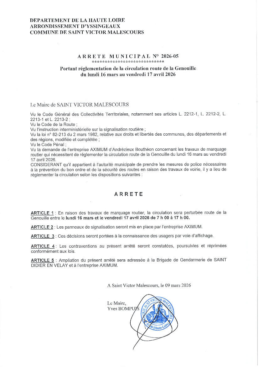 Arrêté Municipal Route De La Genouille 12/03/2026 En raison de travaux de marquage, la circulation pourra être perturbée route de la Genouille (entre le Trève et Saint Didier) entre le lundi 16 mars et le vendredi 17 avril 2026 de 7h et 17h. Merci de votre compréhension !