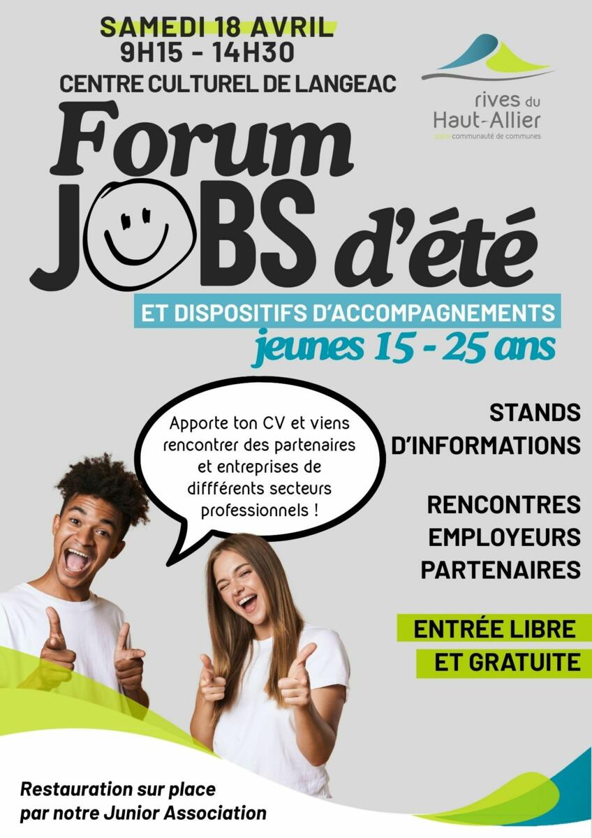 Forum JOBS d'été à Langeac 🤝 27/03/2026 Forum JOBS d'été le samedi 18 avril de 8h15 à 14h30 au centre culturel de Langeac ⤵