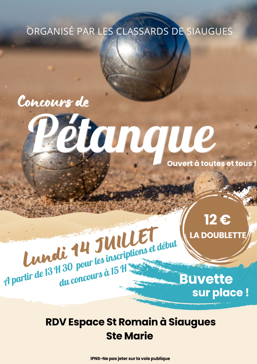 - A 15h, les classards de Siaugues organisent un concours de pétanque (12€ la doublette - inscription sur place dès 13h30). Buvette sur place !