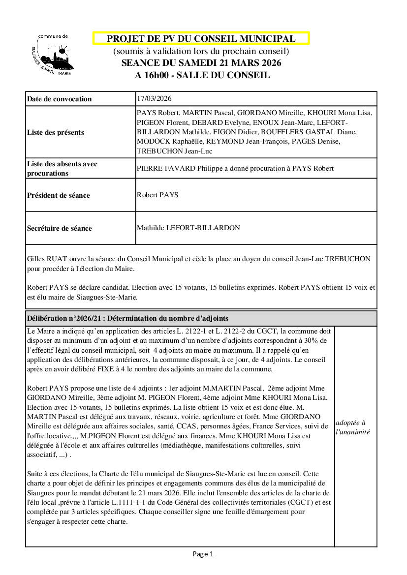 PROJET DE PV DU CONSEIL MUNICIPAL (soumis à validation lors du prochain conseil)