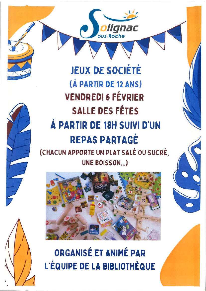 L'équipe de la bibliothèque vous invite à une soirée Jeux suivie d'un repas partagé le vendredi 6 février à partir de 18 heures à la salle des fêtes.