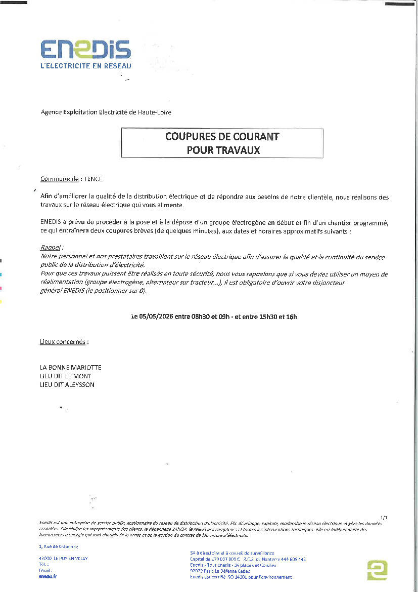 En raison de travaux sur le réseau, Enedis nous informe d'une coupure d'électricité à la date du MARDI 5 mai 2026 de 8H30 ET 9H -15h30 ET 16H sur le secteur suivant :