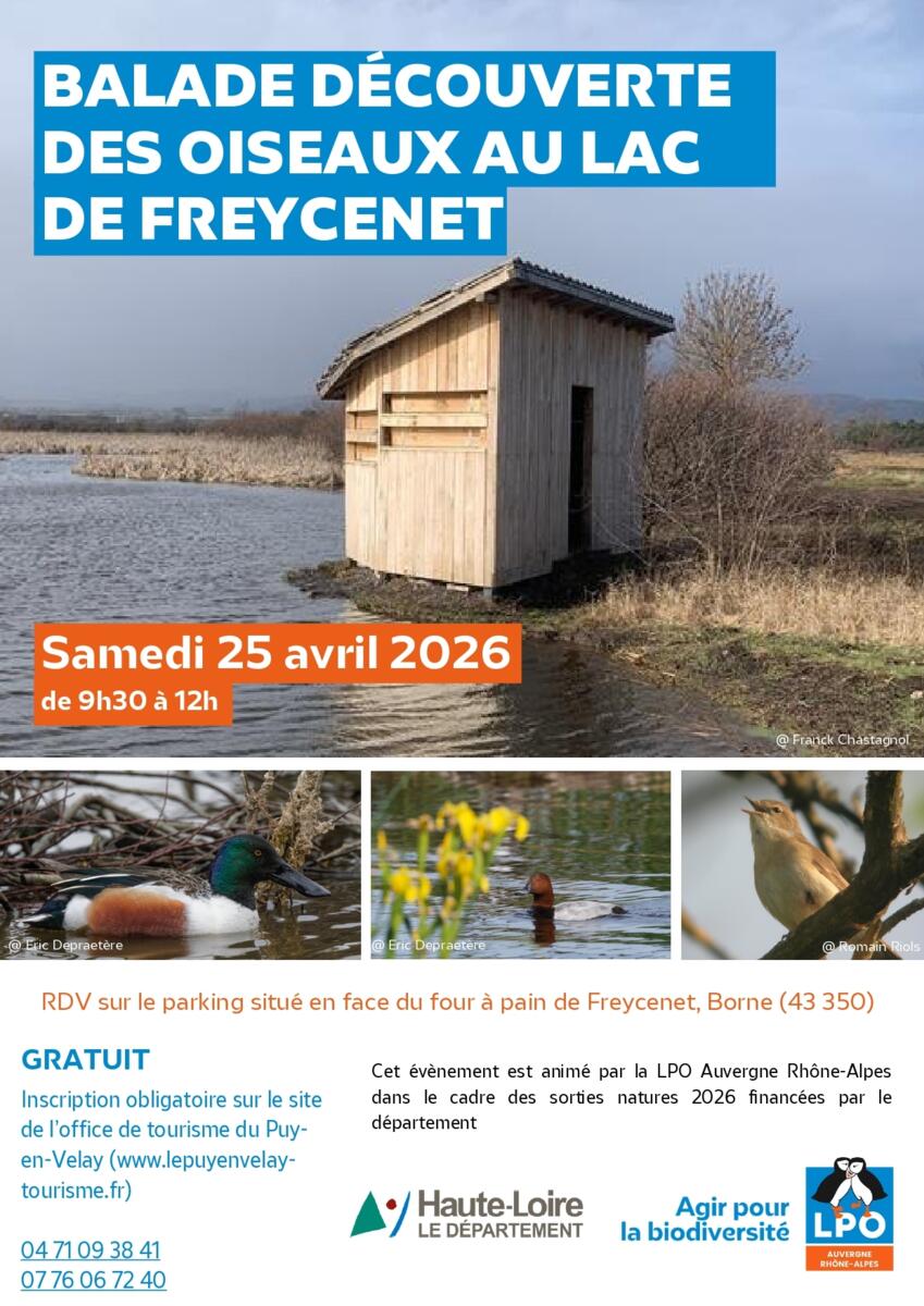 Dans le cadre des sortie natures du département de la Haute-Loire, la LPO propose une animation ce SAMEDI 25 AVRIL à 9h30 au lac de Freycenet à Borne afin de découvrir les oiseaux et la biodiversité du site.