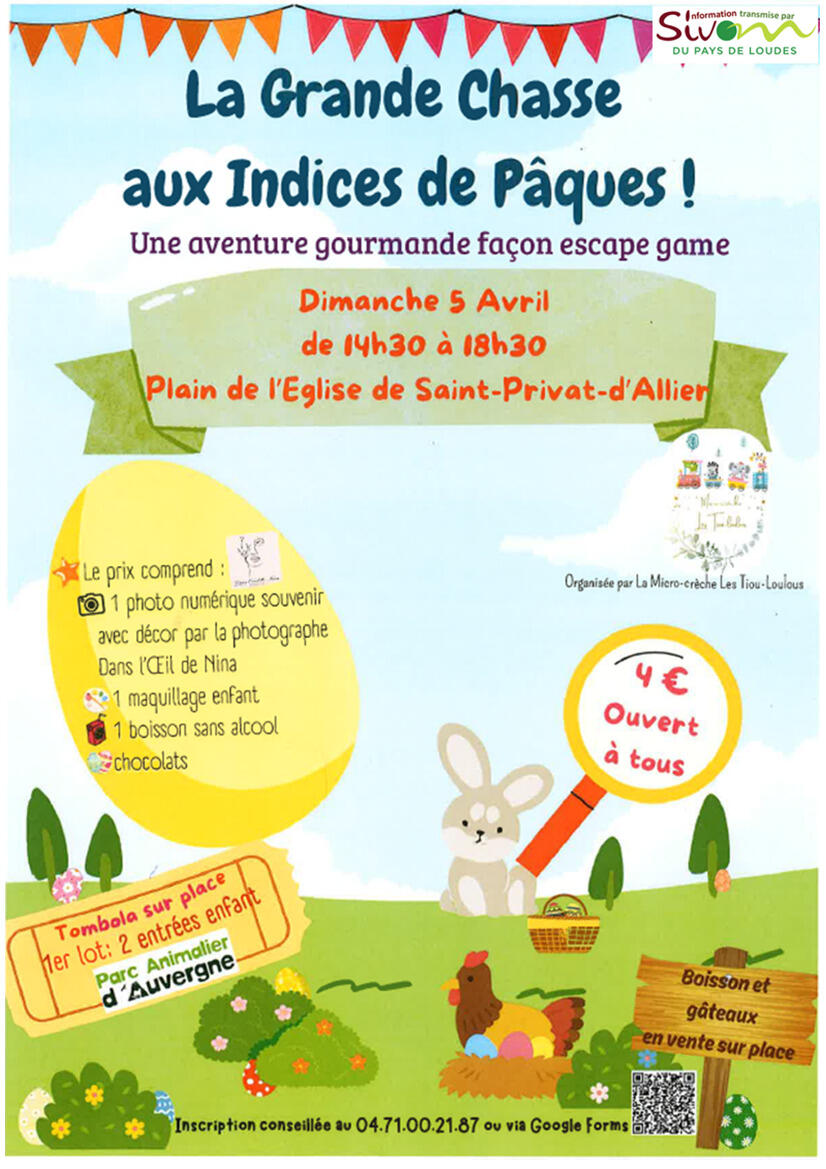 Veuillez trouver ci-dessous l'affiche de la CHASSE AUX INDICES DE PÂQUES ST PRIVAT D'ALLIER le 5 AVRIL 2026.