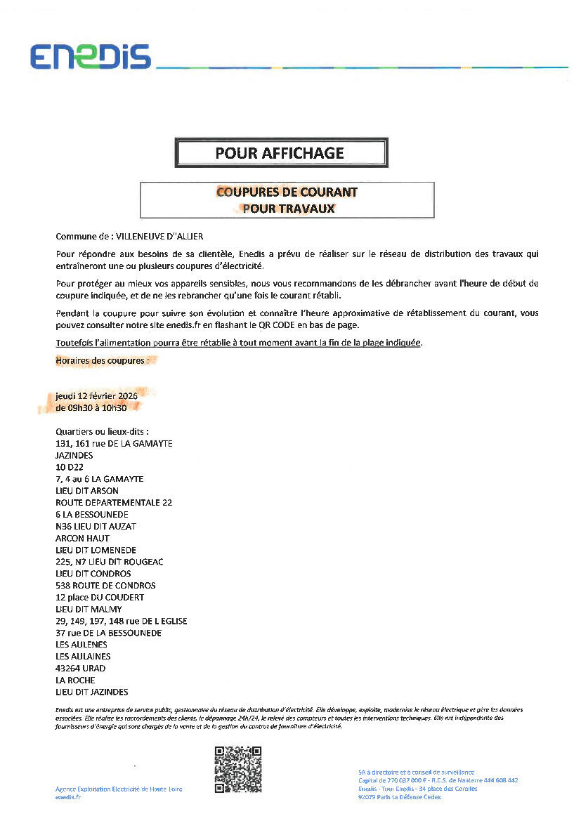 ENEDIS COUPURE DE COURANT POUR TRAVAUX