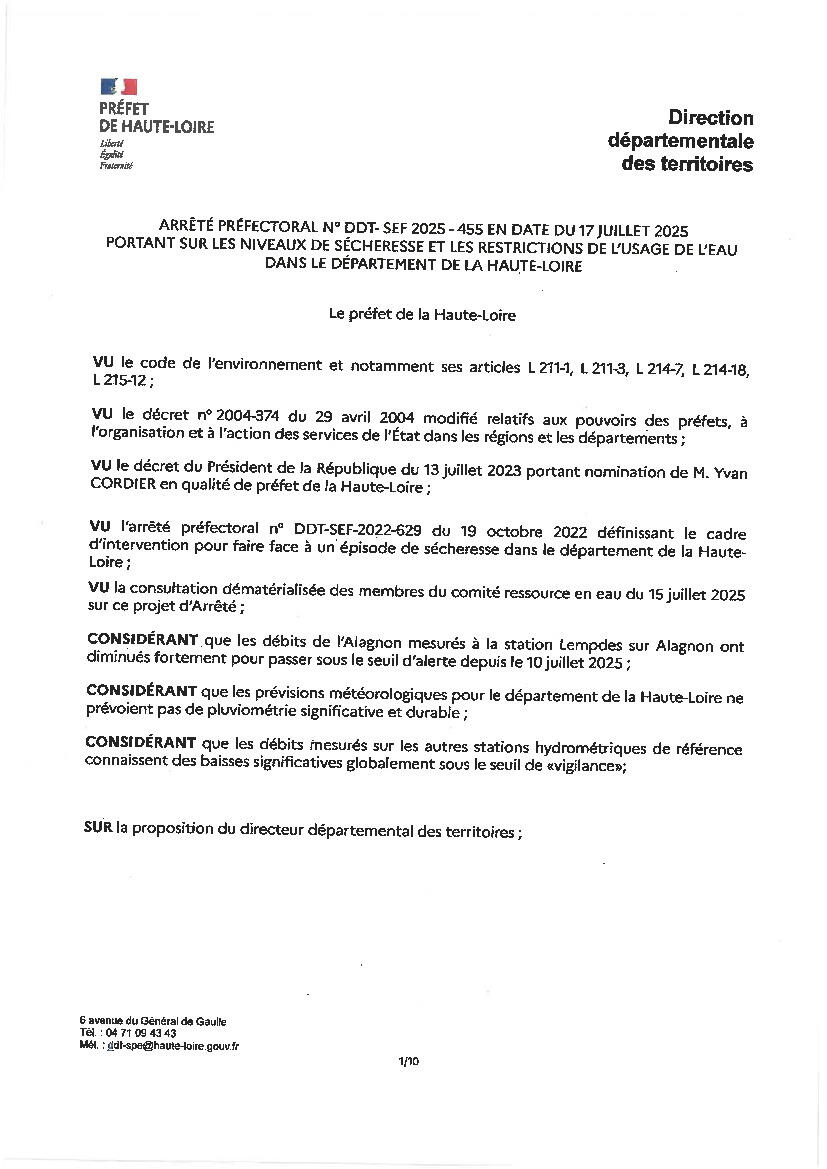 ARRETE PREFECTORAL N°DDT-SEF-455 EN DATE DU 17 JUILLET 2025 23/07/2025 PORTANT SUR LES NIVEAU DE SECHERESSE ET RESTRICTIONS DE L'EAU