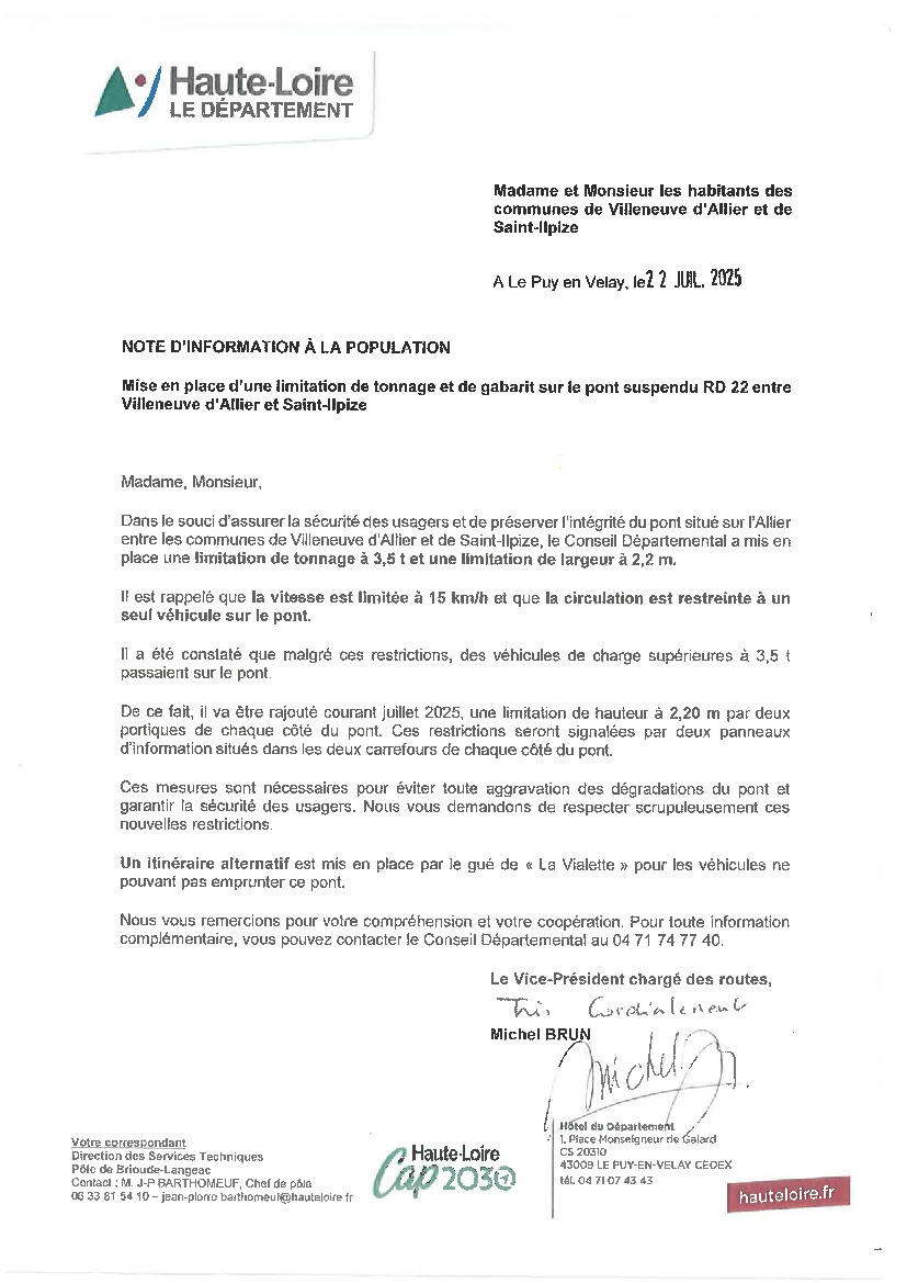 MISE EN PLACE D'UNE LIMITATION DE TONNAGE ET DE GARABIT SUR LE PONT SUSPENDU RD22 ENTE VILLENEUVE D'ALLIER ET SAINT-ILPIZE