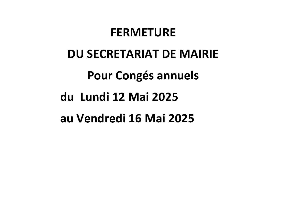 SECRETARIAT DE MAIRIE 07/05/2025 FERMETURE POUR CONGES ANNUELS DU LUNDI 12 MAI 2025 AU VENDREDI 16 MAI 2025