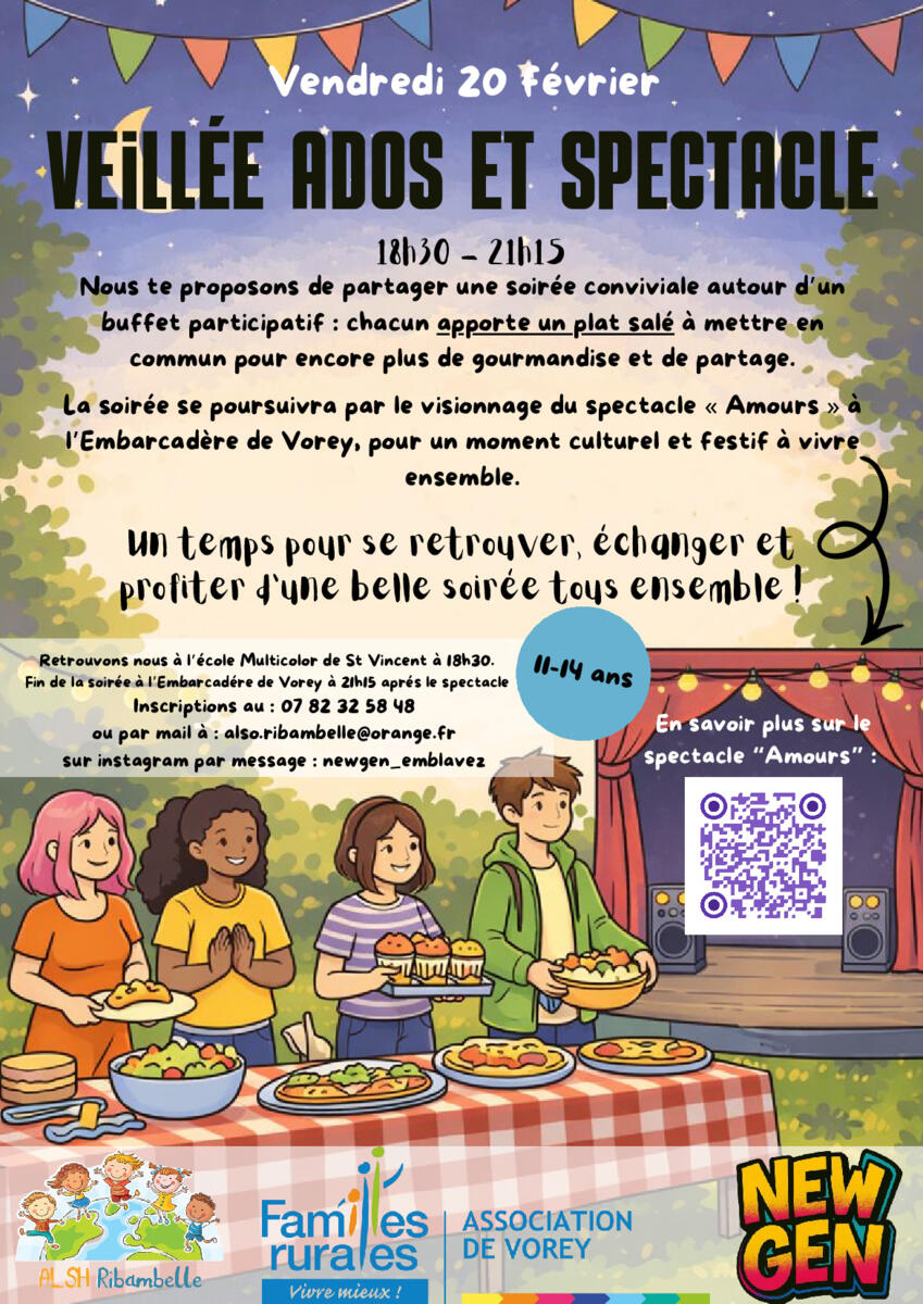 Le vendredi 20 fĂ©vrier, une veillĂ©e Ă buffet participatif sera organisĂ©e, suivie d'un spectacle Ă l'Embarcadère de Vorey "Amours".Â